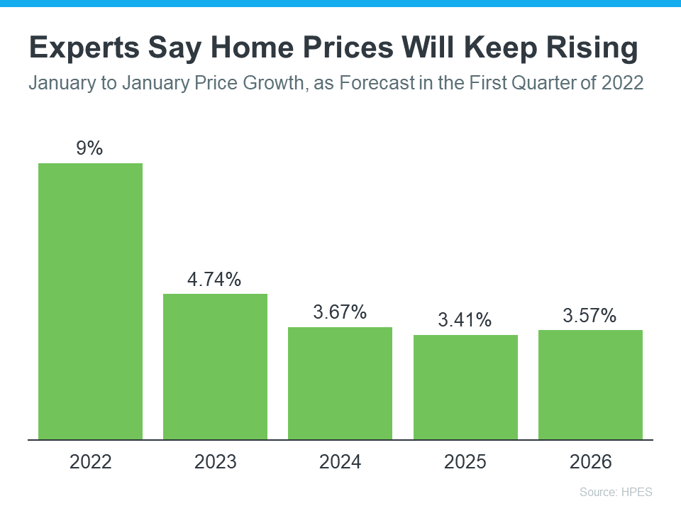 Because it will take some time for housing supply to increase, experts believe prices will continue rising. The latest Home Price Expectations Survey forecasts what will happen with home prices over the next 5 years. As the graph below shows, while the rate of appreciation will moderate over the next few years, prices will continue rising through 2026: