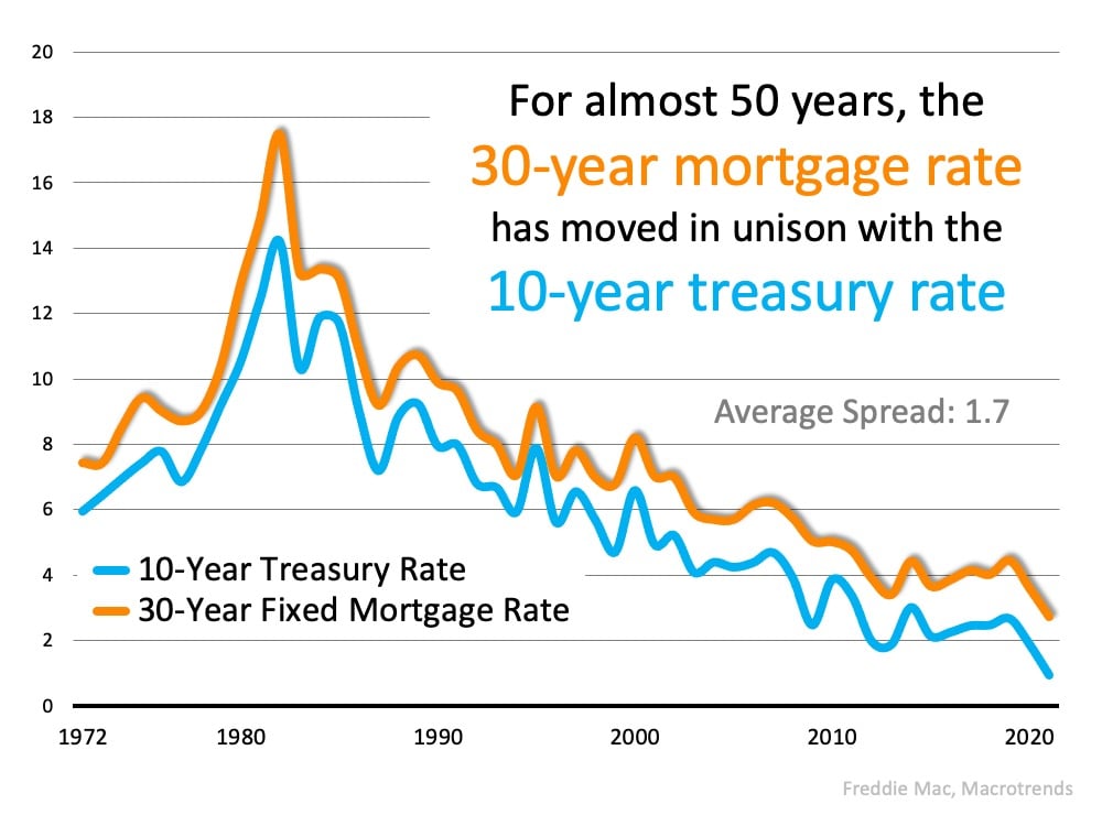 Many things impact mortgage rates. The economy, inflation, and Fed policy, just to name a few. That makes forecasting rates difficult. However, there’s one metric that has held up over the last fifty years – the relationship between mortgage rates and the 10-year treasury rate. Here’s a graph detailing this relationship since Freddie Mac started keeping mortgage rate records in 1972: