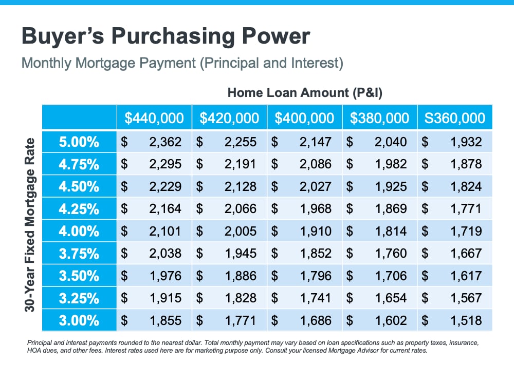 Mortgage rates have increased significantly since the beginning of the year. Each Thursday, Freddie Mac releases its Primary Mortgage Market Survey. According to the latest survey, the average 30-year fixed-rate mortgage has risen from 3.22% at the start of the year to 3.55% as of last week. This is important to note because any increase in mortgage rates changes what a purchaser can afford. To give you an idea of how rising mortgage rates impact your purchasing power, see the table below: